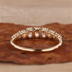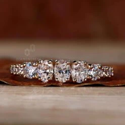 This listed lab grown diamond wedding ring comes with three oval lab grown diamond sets with simple four prongs. Another set of four round lab grown diamond is set on each side of the oval diamond and make the band looks distinctive. This wedding band looks iconic with the combination of oval and round cut diamonds. Select this beautiful lab grown diamond wedding ring for your life love.