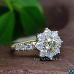 This affordable moissanite engagement ring features a center light yellow round old European cut set in eight prongs. Classic cluster halo set of colorless old European cut surrounds the center beauty of champagne round old European cut moissanite. Side colorless three round cut moissanite held in the tapered shank.