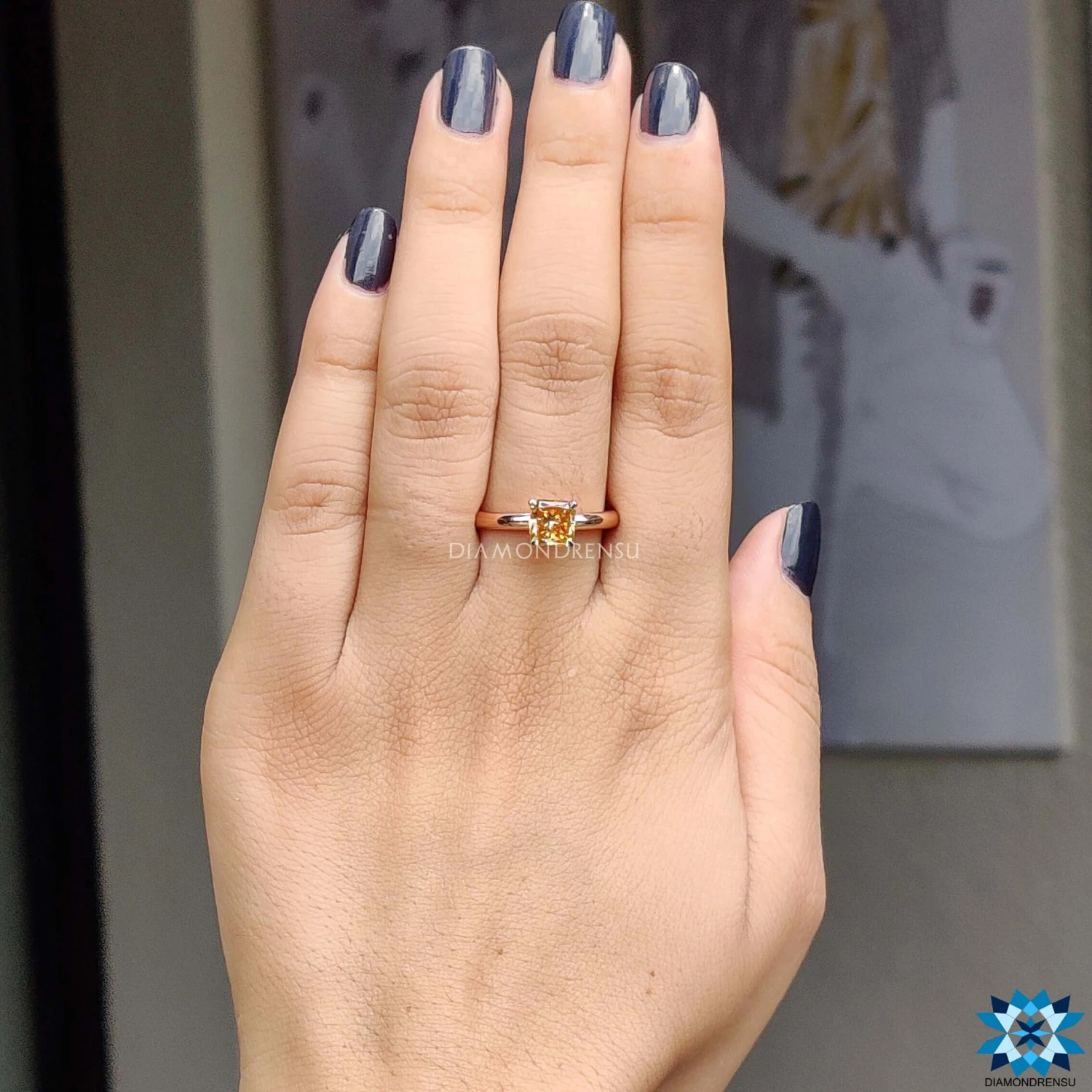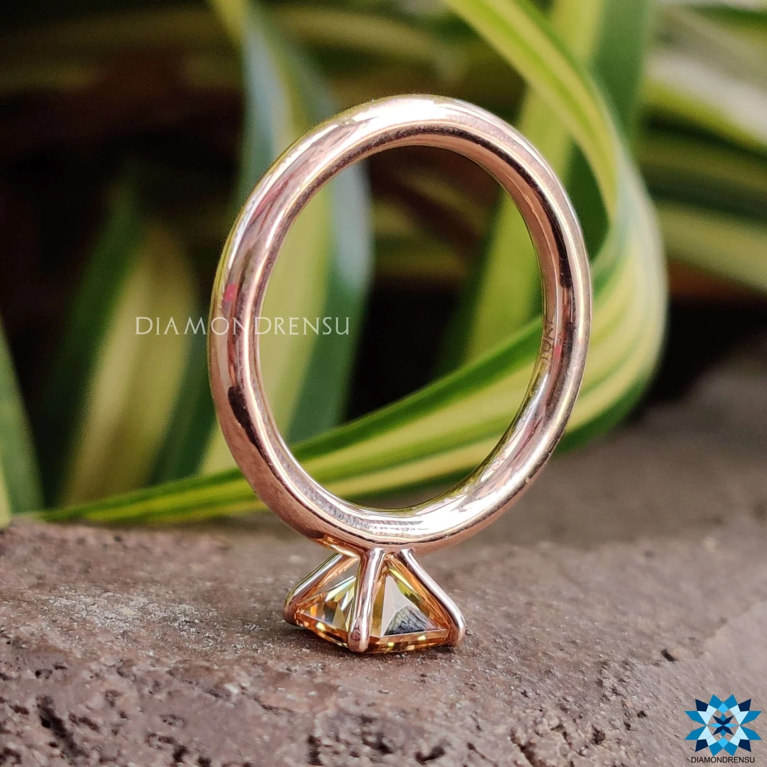 Moissanite solitaire ring set in rose gold are currently trending. A solitaire engagement ring is the best choice for proposing to her on this valentine. This moissanite engagement ring featuring the center beauty of orange radiant cut moissanite set in four prongs with precious rose gold.Â