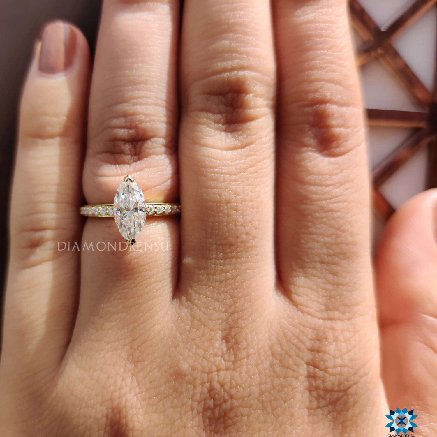 Breathe life into your imaginations at Diamondrensu as we make it possible for you to design jewelry exhibiting all the features you love and adore. Lovely marquise cut pave set moissanite wedding ring