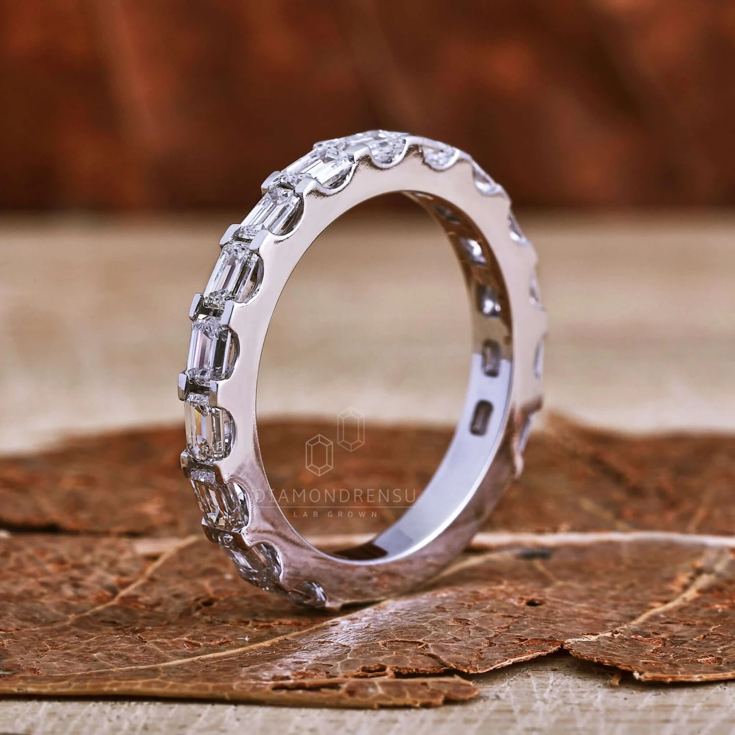 This lab grown diamond eternity wedding band comes with a colorless emerald cut lab created diamond. The minimal beauty of lab grown diamonds is decorative on three fourth part of the band. An emerald cut diamond wedding band adds extra sparkles and beauty. The eternity ring is the most famous and popular choice for everyone for any occasional and routine life wear also.