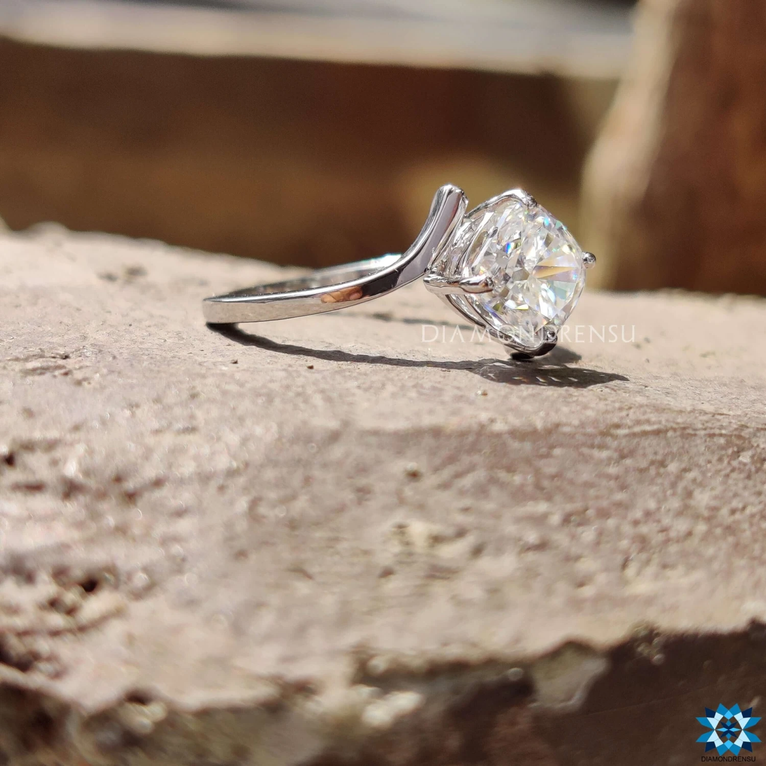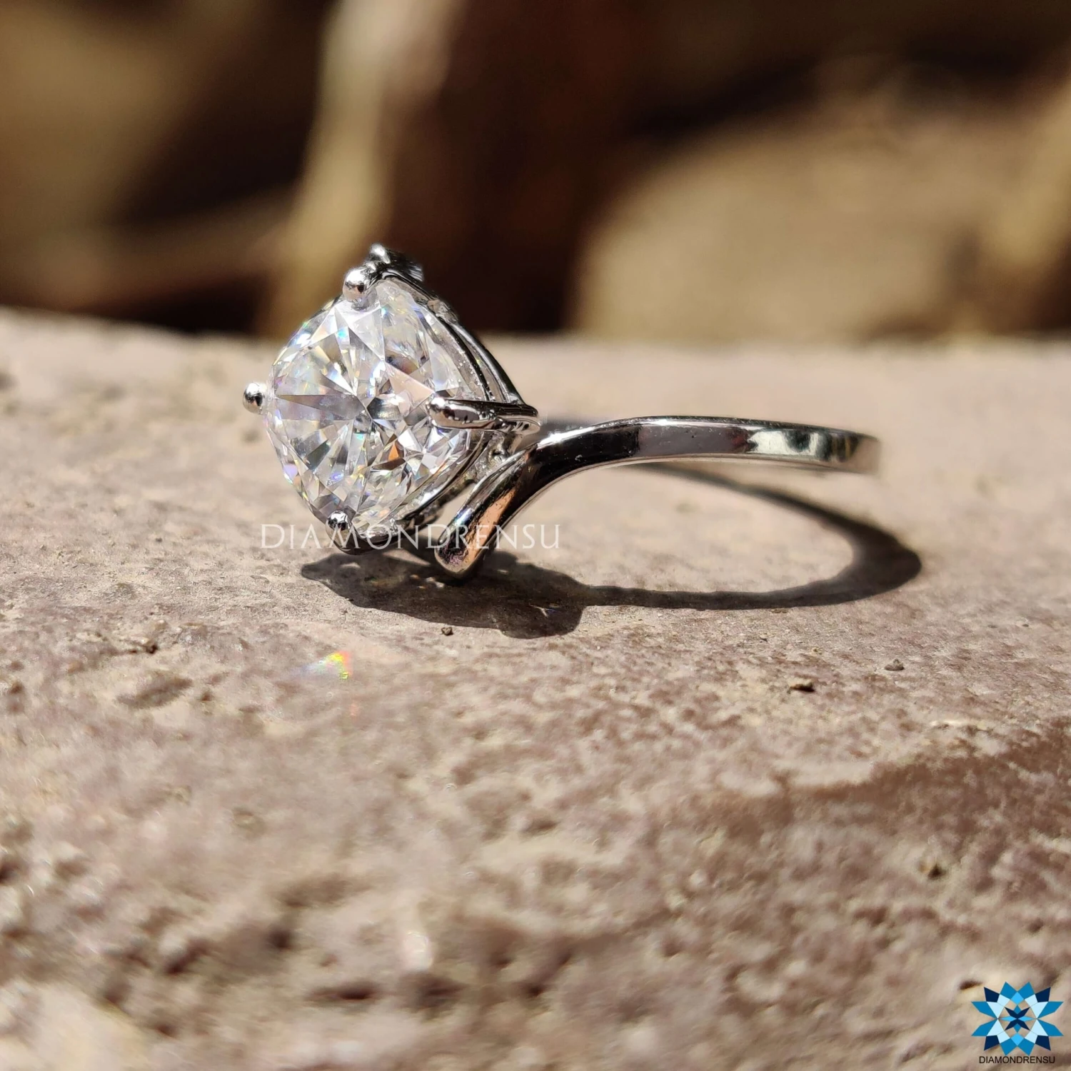 1.54 Carat center cushion cut moissanite diamond looks beautiful in this lovely solitaire setting. The bypass setting gives an extra charm to the center cushion cut moissanite diamond. Create your own engagement ring!Â