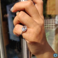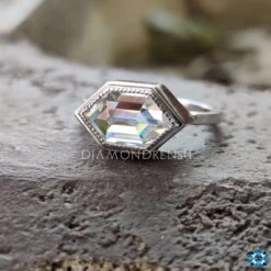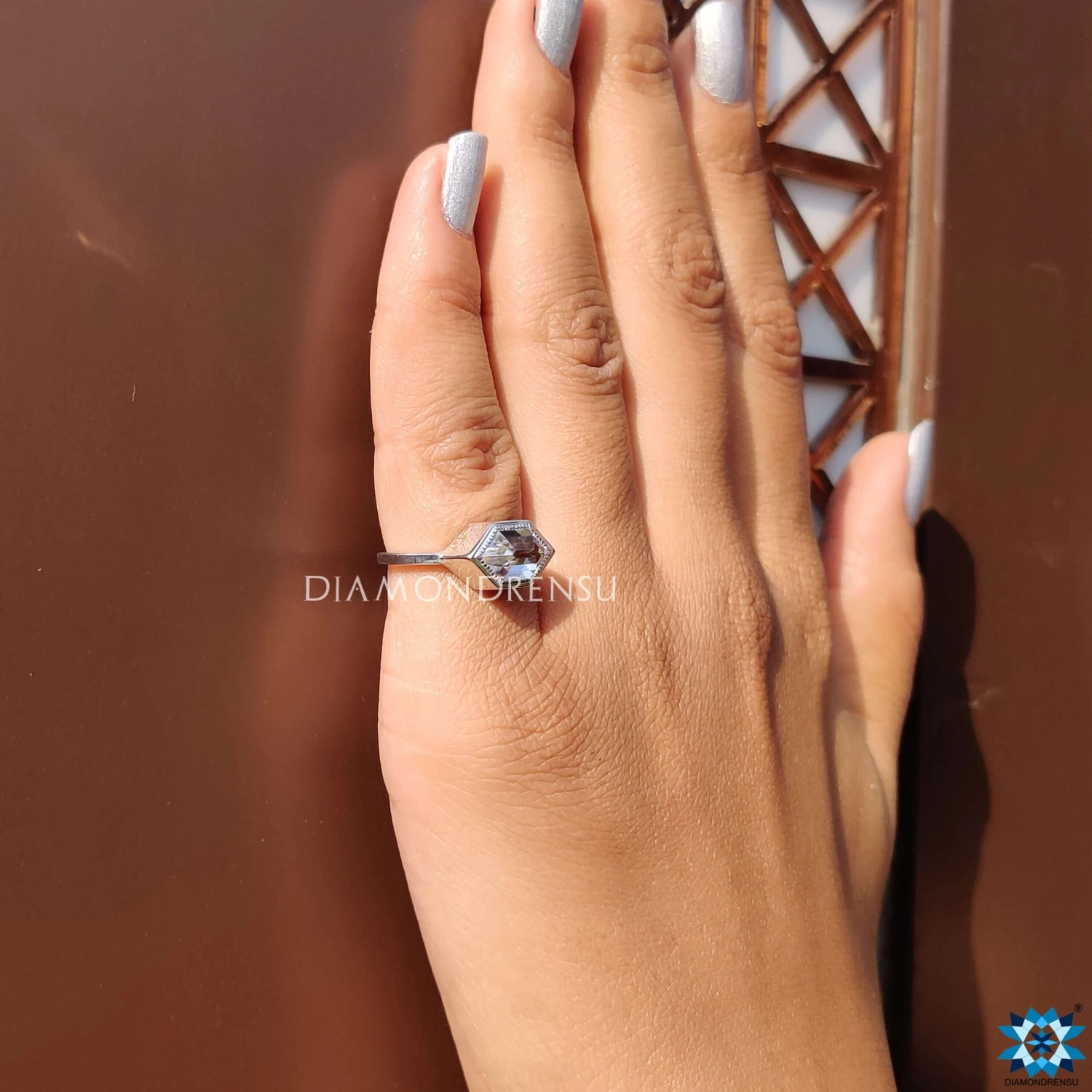 Gracefully milgrain outline bezel set adds a modern touch to this simple traditional solitaire setting. This unique moissanite engagement ring comes with a center hexagon rose cut, which is the heart of this engagement ring. Center rose cut mounted in the east to west milgrain bezel setting which gives a modern and classic look to the solitaire engagement ring.