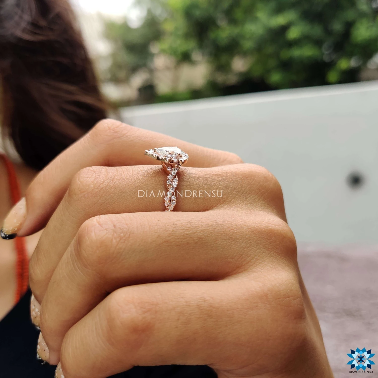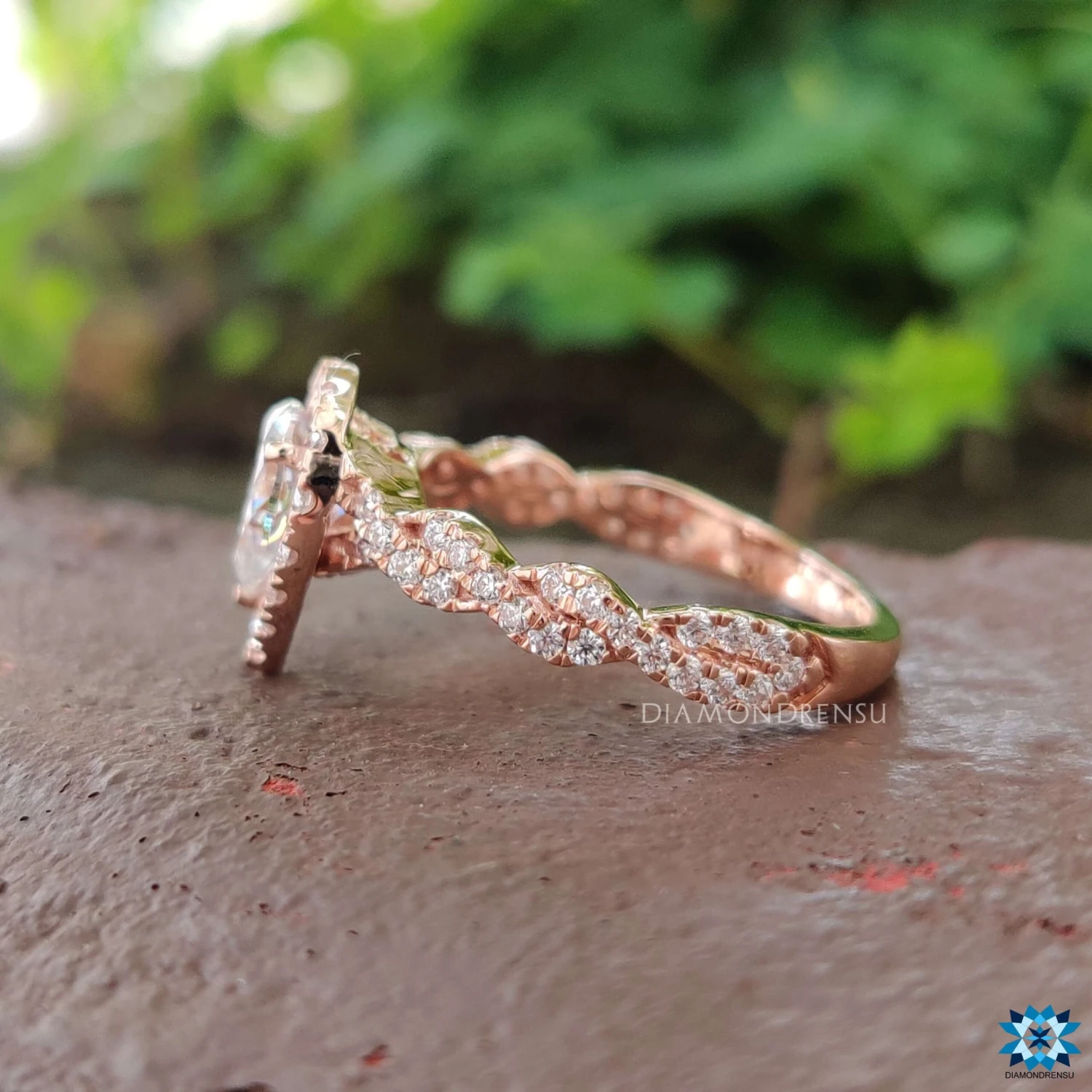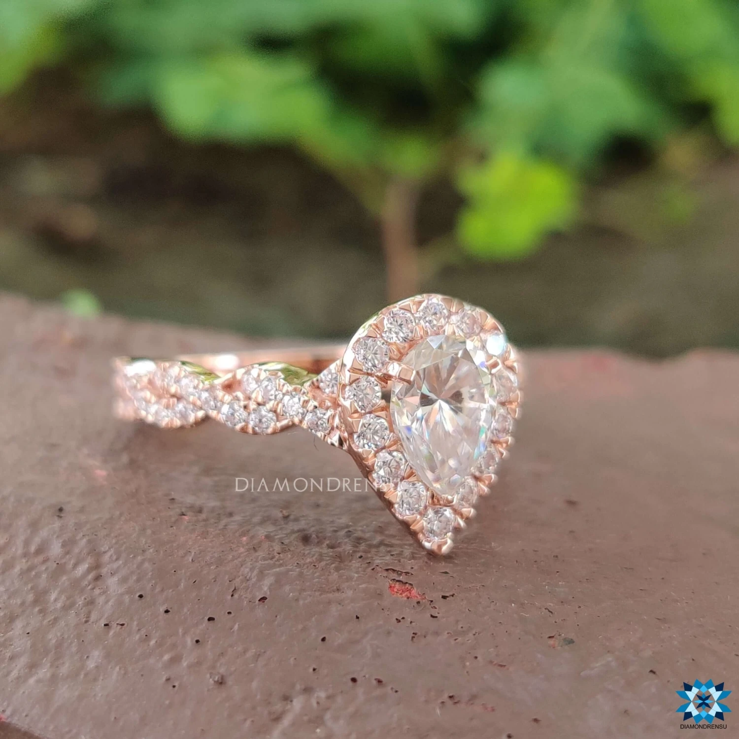 Discover glamorous pear moissanite engagement ring to make some events more and more special. Take her a special surprise with this intricate solid rose gold pear cut halo twist moissanite engagement ring.Â
