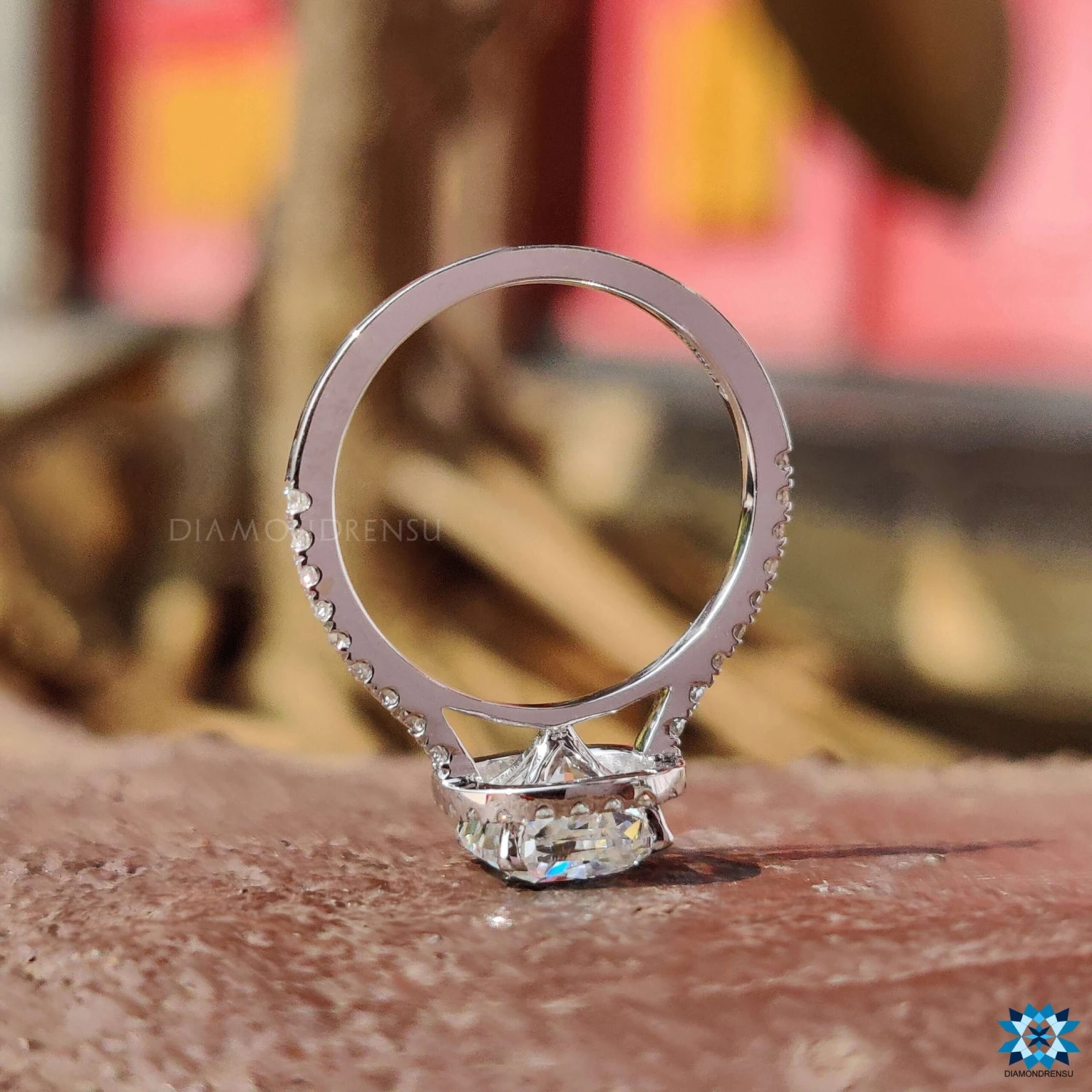 This timeless moissanite halo engagement ring features a center cushion cut moissanite looks amazing with a pave’ of tiny round moissanite diamonds. Another little round cut moissanite surrounding the center stone and create a delicate halo effect to the moissanite ring