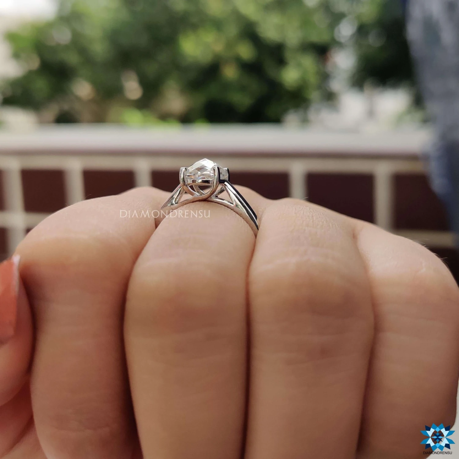 This beautiful moissanite solitaire engagement ring features a four-prong trellis-style that perfectly catches the center round rose-cut colorless moissanite diamond. This simple claw prongs solitaire engagement ring be the best wedding gift ring for her
