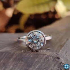 Moissanite round cut diamond is the first and most popular choice for a moissanite engagement ring. In a bezel setting, the stone is enclosed by a metal rim. The bezel setting protects the stone than other types of settings, such as the prong setting.