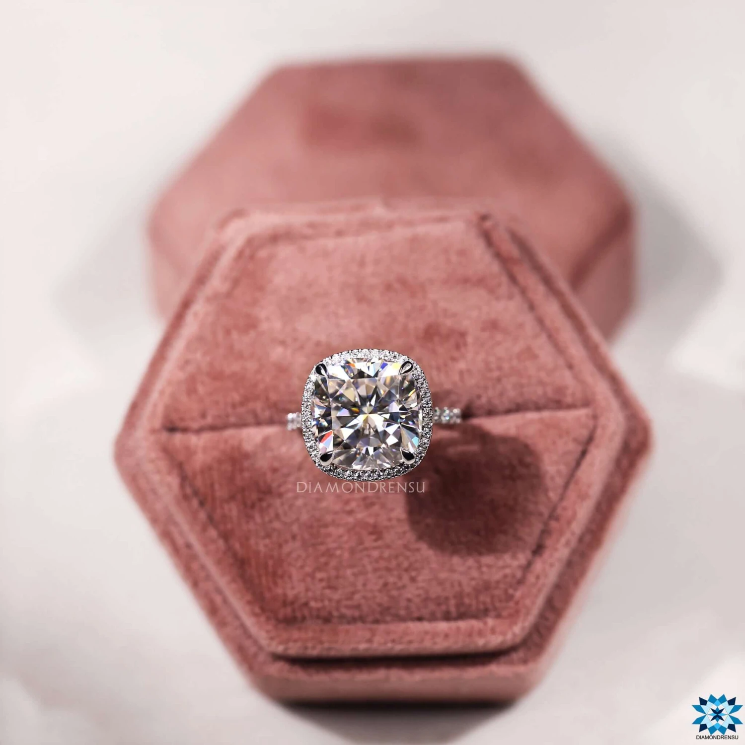 A beautiful cushion cut halo engagement ring features both the soft, rounded corners of the cushion cut and the dazzling “halo” of accent diamonds encircling the center stone. This blend of popular styles makes for a bold, beautiful ring.