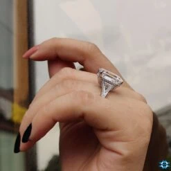 Moissanite emerald cut engagement ring is perfect for any occasion and function. The split shank affordable moissanite engagement ring style features a band that parts as it reaches the center head part of the ring. The best and beautiful moissanite halo engagement ring for her.