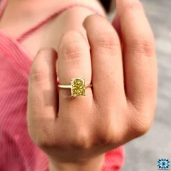 This cushion rose cut moissanite solitaire engagement ring includes a center moissanite stone held by four claw prongs. This moissanite engagement ring feature a Cushion rose cut moissanite center stone set in a compass setting. A compass set of tiny round moissanite covers under the center stone as a hidden halo style. This beautiful yellow gold moissanite engagement ring looks shiny and dazzling.