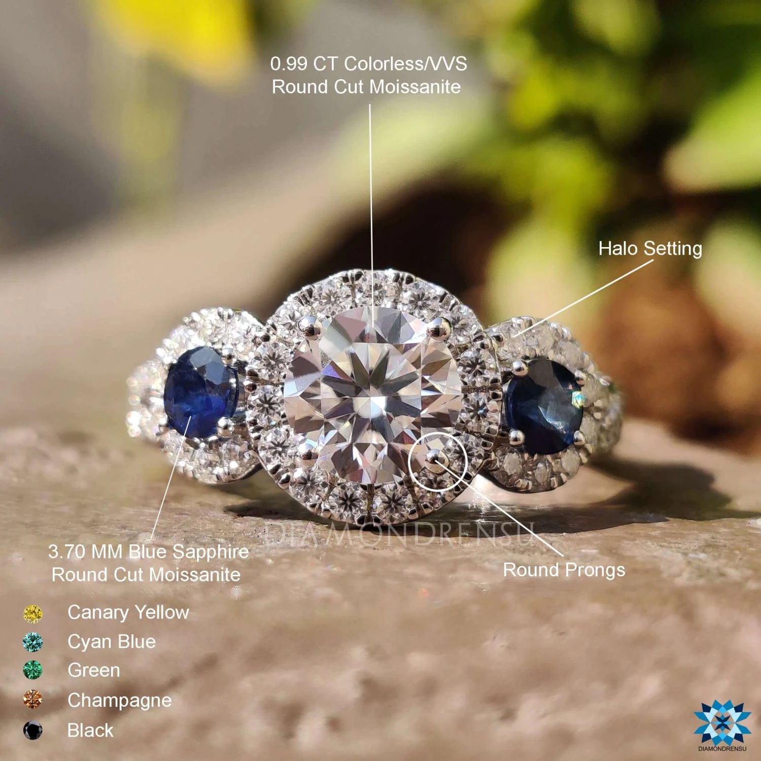 The three stones halo engagement rings combine the much love halo design that rich with the lovely three stone setting, side blue sapphire gives a vintage and lovely look to the engagement ring