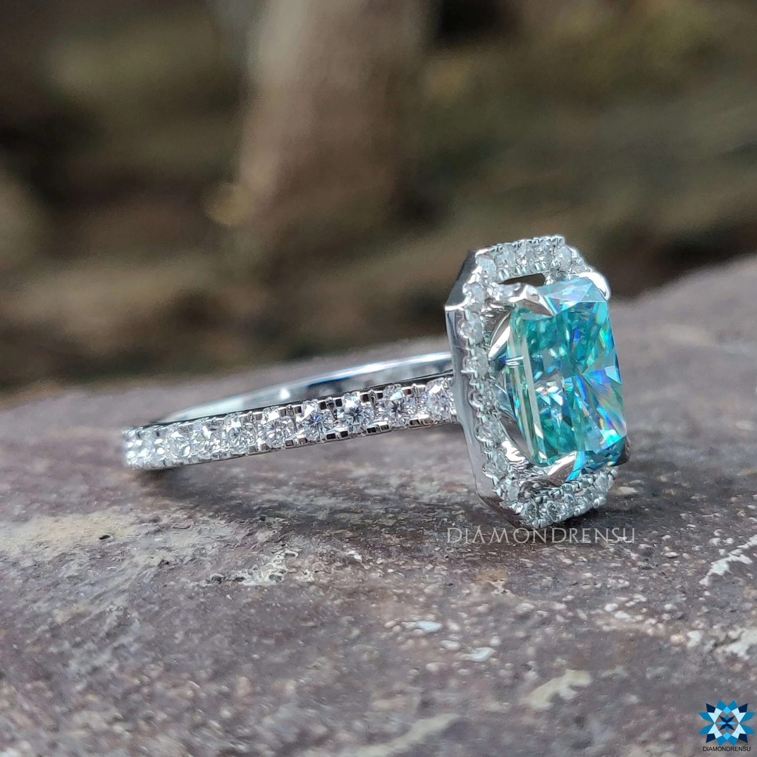 Classic and dazzling, This halo engagement ring contains center cyan blue radiant cut moissanite with halo pave setting of colorless round brilliant cut moissanite diamond. This amazing halo wedding ring is popular for its sparkling and setting
