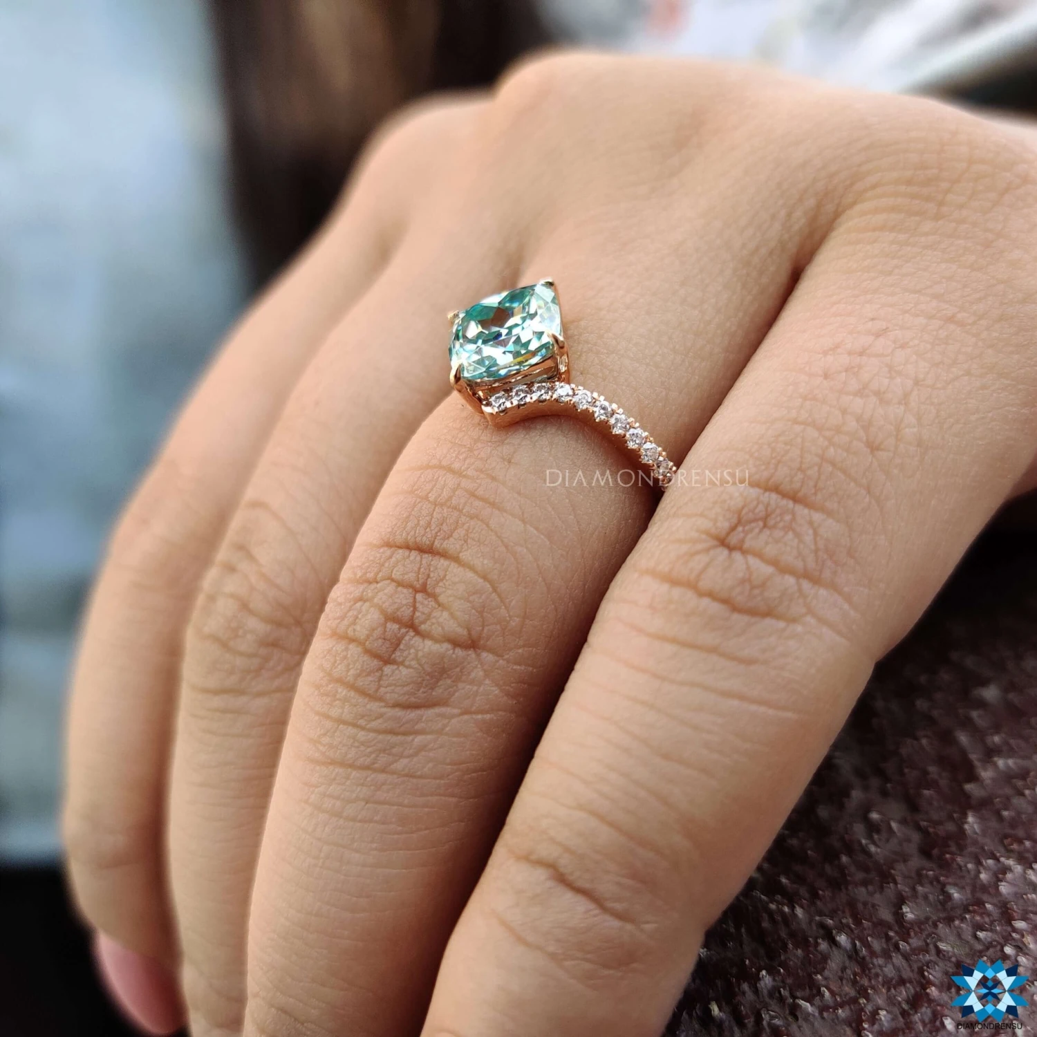 A modern bypass pave’ moissanite engagement ring features delicate cyan blue cushion rensu cut moissanite as a center stone adds glamour to the ring. This is a dramatically modern interpretation of classic vintage style engagement ring with just the right amount of pave’