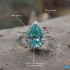 Be the first to review “2.30 TCW Cyan Blue Pear Cut Halo Pave Moissanite Wedding Ring” Cancel reply