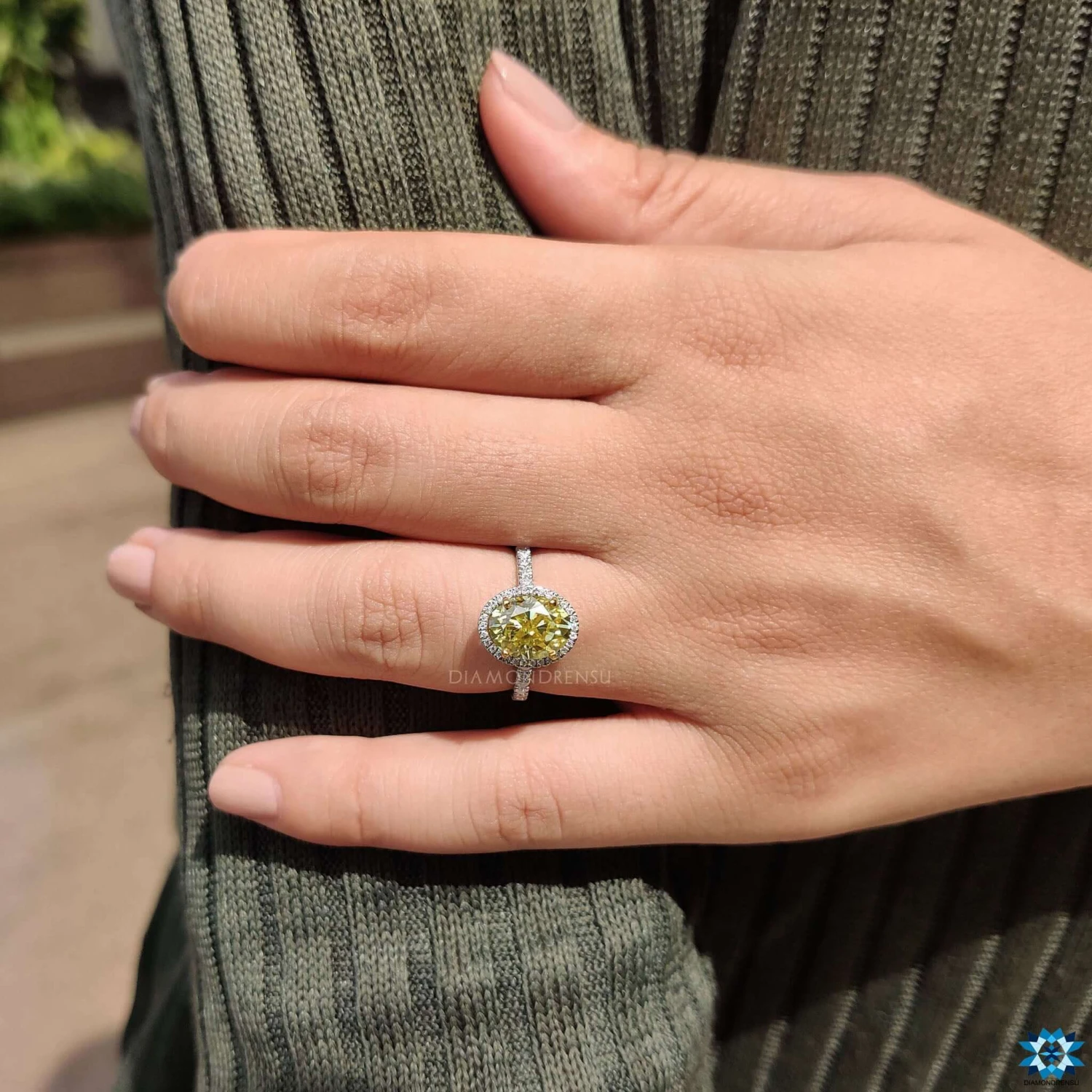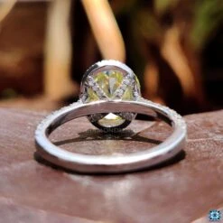 Diamondrensu’s fabulous halo engagement ring features a yellow oval cut moissanite stone set in the center place of the engagement ring. The tiny Round brilliant cut moissanite stones have arranged around the middle stone. The center stone has mounted on a beautiful pave set that is attractive through the minimal round cut stone moissanite stones.