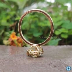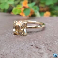 This lovely petite and delicate simple solitaire moissanite engagement ring features a classic four-prong setting has a rounded inside edge which gives unique shine to the center sparkly light yellow cushion old european moissanite