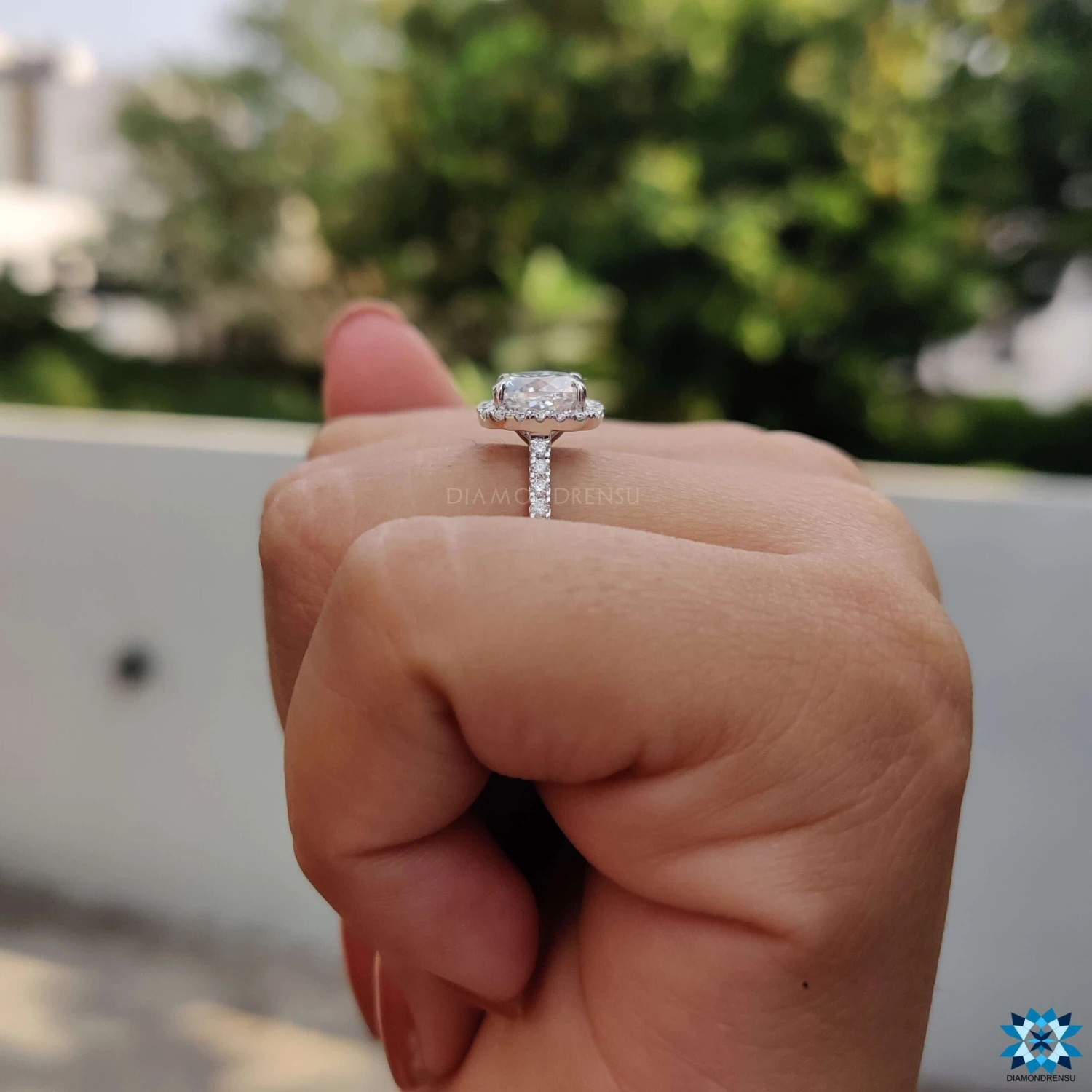 Delicate in design, this classic moissanite halo engagement ring showcases a cushion rensu cut as a center stone framed by a little round cut moissanite diamond of your choice, Mother’s day special gift ring