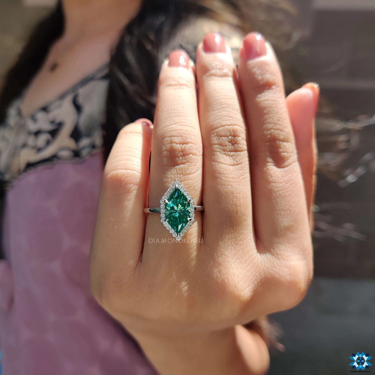 A listed moissanite halo engagement ring features a center shine of green dutch marquise cut moissanite. The halo style is decorative with the tiny round cut moissanite stones around the green Dutch marquise stone. This cathedral set moissanite engagement ring will look beautiful on the finger of your bride-to-be. The moissanite halo engagement ring is a high choice for couples who seek to symbolize their love with more than a single stone.