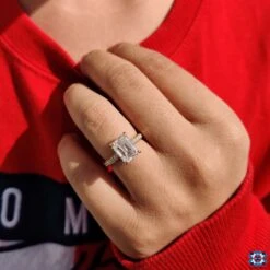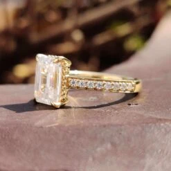 This listed moissanite emerald cut engagement ring comes with elegant eye-catching emerald cut moissanite held in claw prongs. In addition, a classic milgrain setting gracefully surrounds the center beauty of the emerald cut. The sleek and modern lines of this eternal engagement ring include a pave set of round cut for a shimmering. This affordable moissanite engagement ring has a cathedral setting, that gives an elegant and classic display to set the center stone.