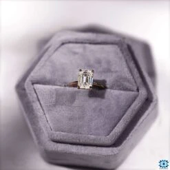 The solitaire engagement rings are a popular choice among today’s couples, it is the perfect gift for her. This moissanite solitaire engagement ring features a center shine of elegant emerald step cut diamond. Beautiful four prongs perfectly catch the center stone and add a comfortable look to the ring.Â