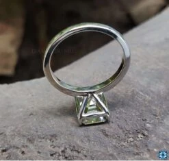 This moissanite engagement ring comes with a simple four prongs setting, which perfectly catches the center sparkling emerald step cut. The rounded comfort fit shank gives an extra comfortable look to the engagement ring. If you are looking for a timeless yet simple solitaire engagement ring, then this is the setting for you.