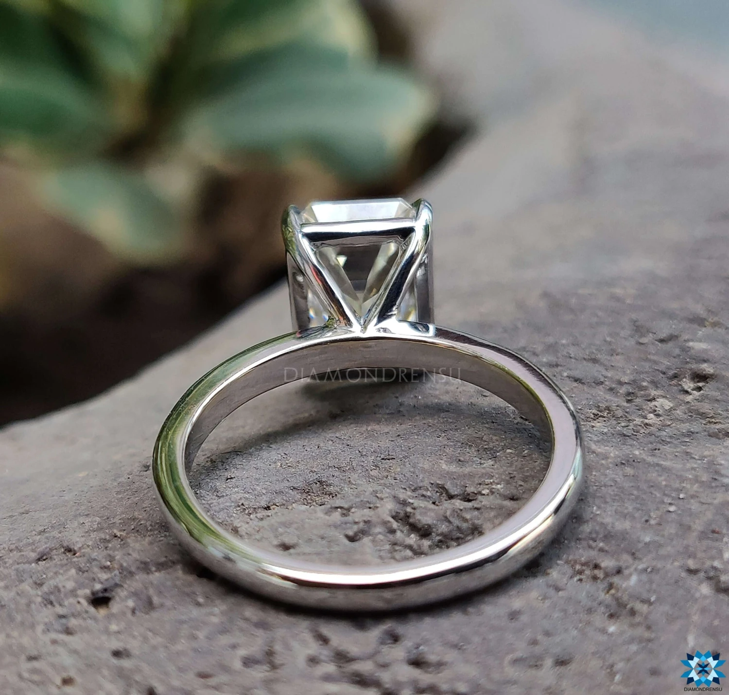Moissanite solitaire engagement ring is a popular term that refers to the engagement ring set with a single stone. Emerald step cut makes your ring larger and bigger than another cut stone with the same carat weight. Moissanite solitaire ring is the first and best choice for gifting her on this valentine.