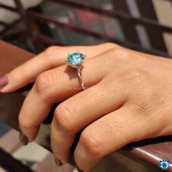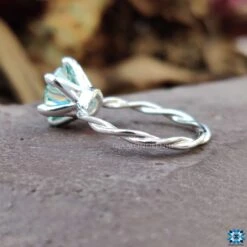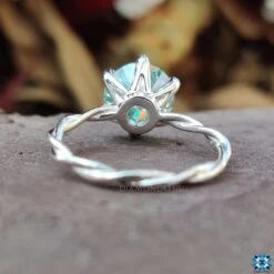 This listed round solitaire engagement ring comes with center cyan blue round brilliant cut gracefully captured with classic six prongs. This unique moissanite engagement ring features a rope twisted shank of precious metal. Which gives a modern touch to the listed engagement ring and makes it perfect for your engagement ceremony.Â