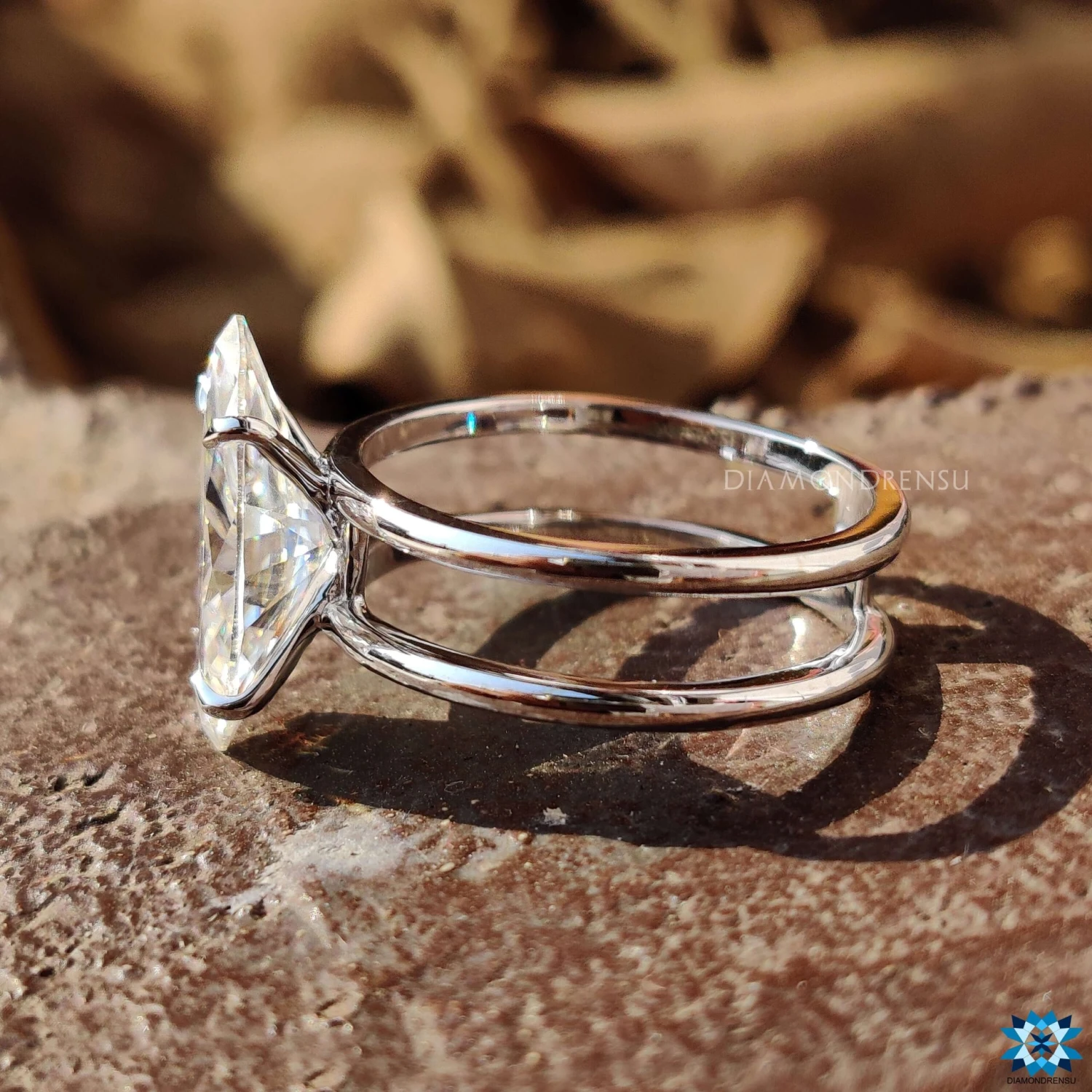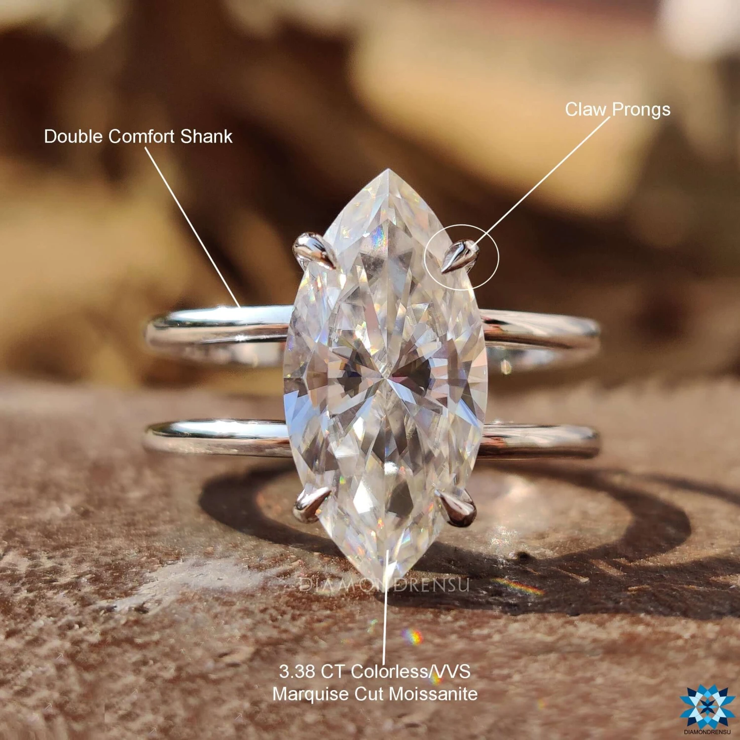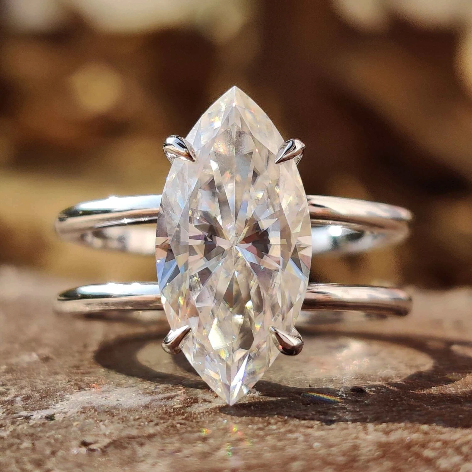 Make a statement that lasts forever with this dual shank moissanite solitaire engagement ring. Delicate and simple solitaire engagement ring features center marquise cut moissanite supported by dual shank that adds a unique look to the ring
