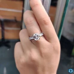Emerald step cut moissanite is a desirable choice for engagement because the emerald cut has a large surface area which makes it appear larger than other moissanite diamonds with the same carat weight.