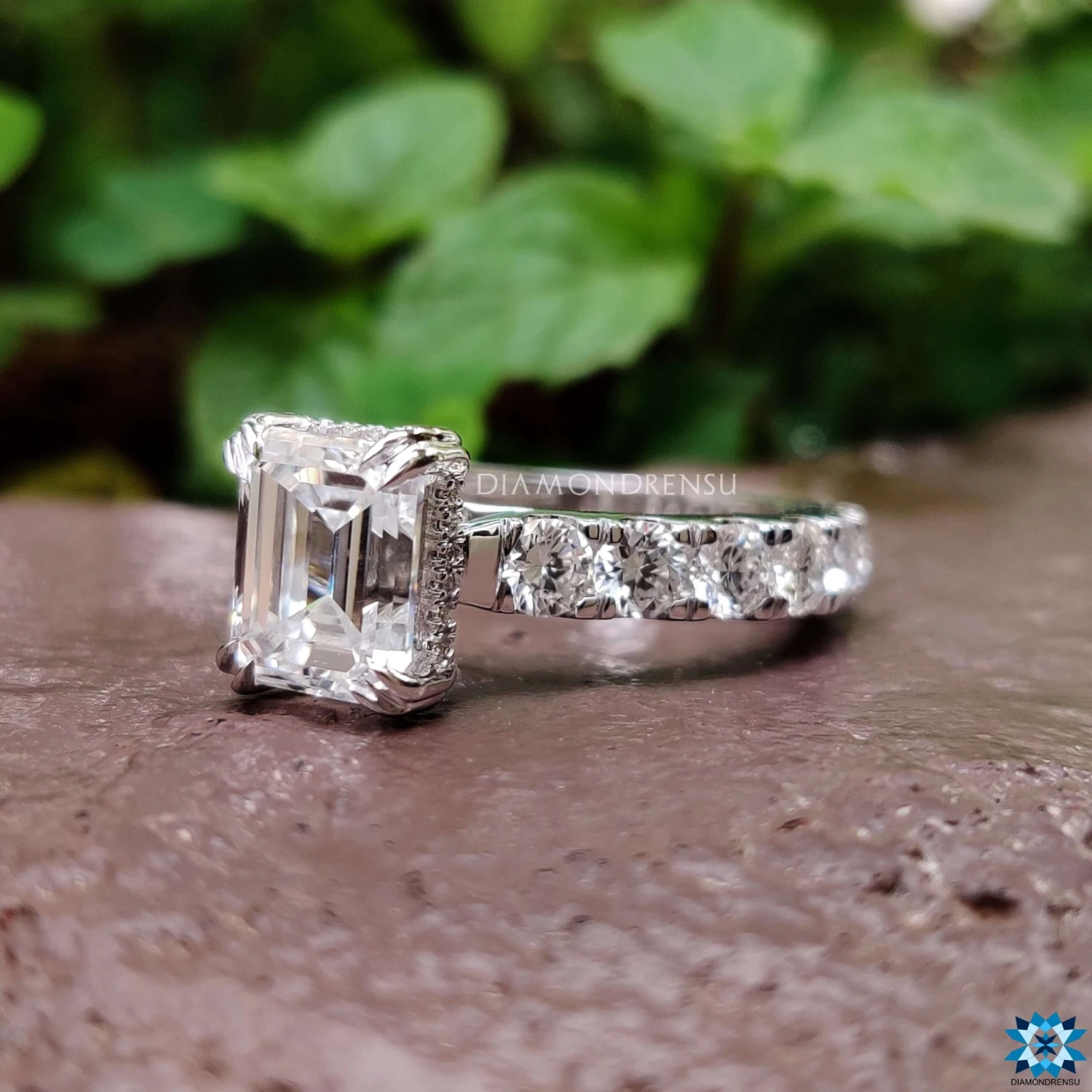 This affordable moissanite diamond engagement ring includes a hidden halo of the round brilliant cut. This elegant moissanite engagement ring features a glittering hidden halo of round cut that wraps around the center emerald step cut. This ring also includes a cathedral setting which gives a supportable look to this best moissanite engagement ring.