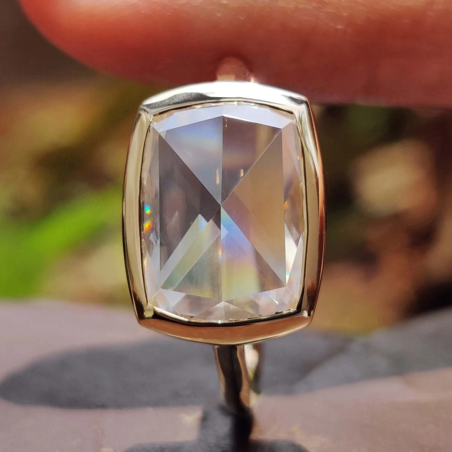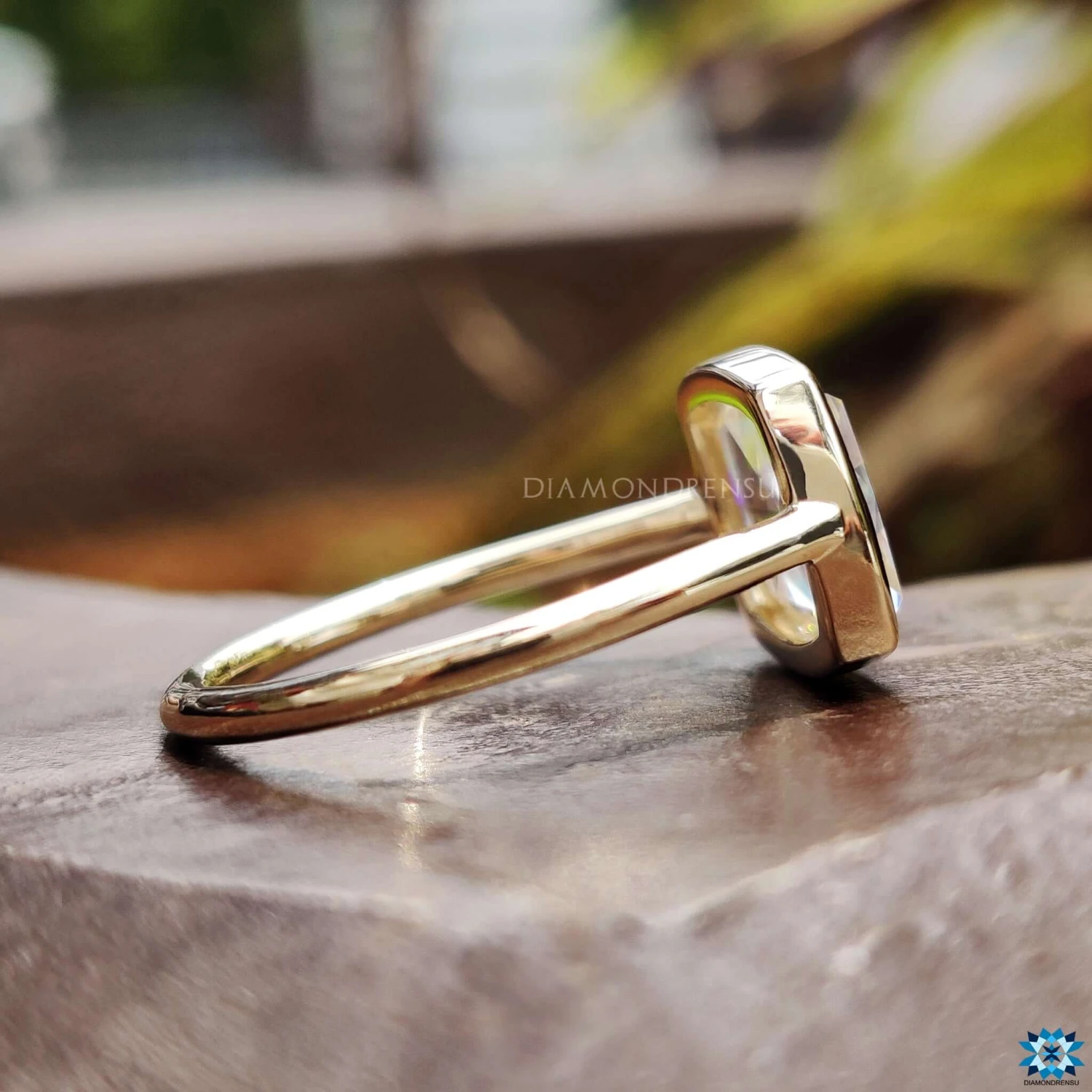 The Moissanite solitaire engagement ring is particularly unique because it highlights the beauty and elegance of the center stone. Want something newest and different in your engagement ring? This bezel-setting cushion rose cut solitaire engagement ring is most beautiful for you. Wear this solitaire moissanite engagement ring in your routine or work life.