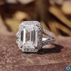 Be the first to review “3.77 TCW Emerald Step Cut Split Shank Halo Moissanite Engagement Ring” Cancel reply