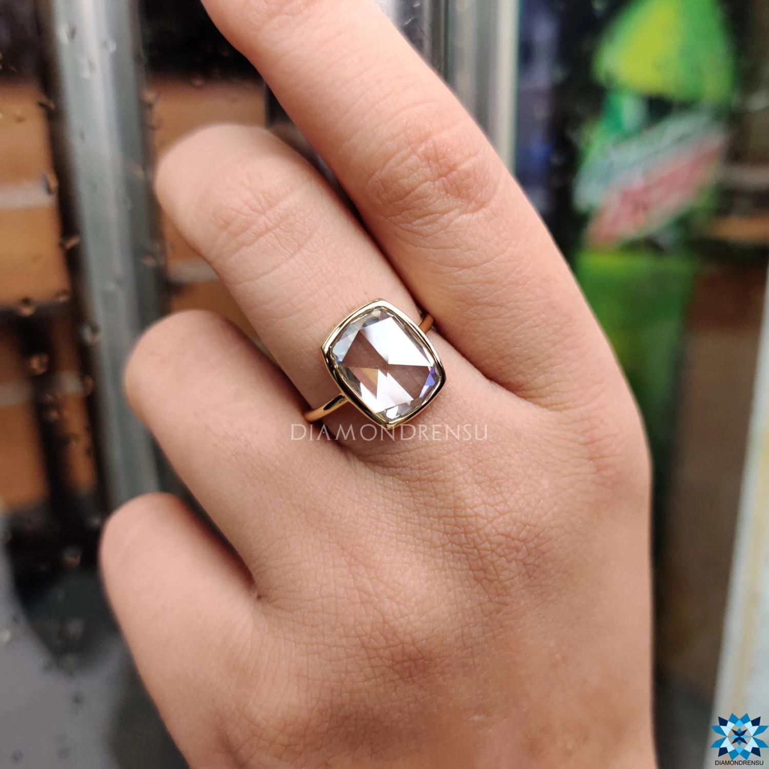 Celebrate your couple’s story with this unique and special cushion rose-cut moissanite bezel set solitaire engagement ring.