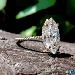 The unique beauty comes with these classic strands of metal twists together for creating an elegant look. This beautiful twisted shank ring holds a shiny hidden halo of round moissanite and gives a unique look to the center colorless marquise cut moissanite