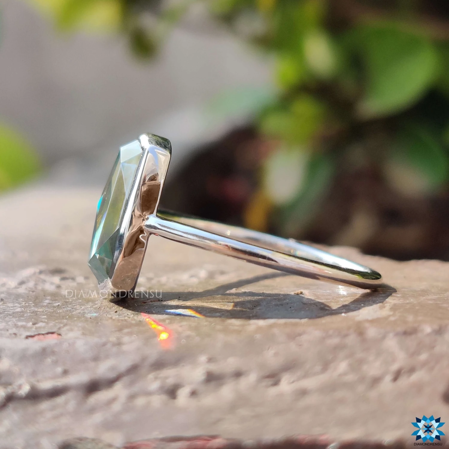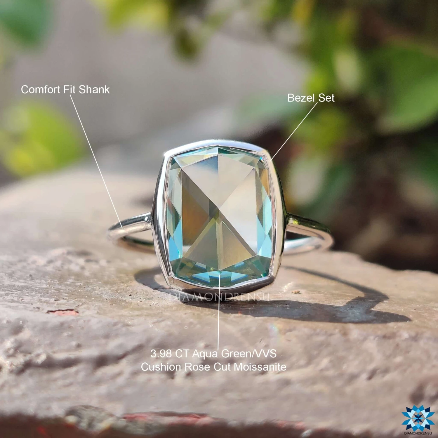 A simple and lovely bezel set solitaire engagement ring includes cyan blue cushion rose cut moissanite diamond covered by bezel setting looks delicate in your finger. The best anniversary gift for her