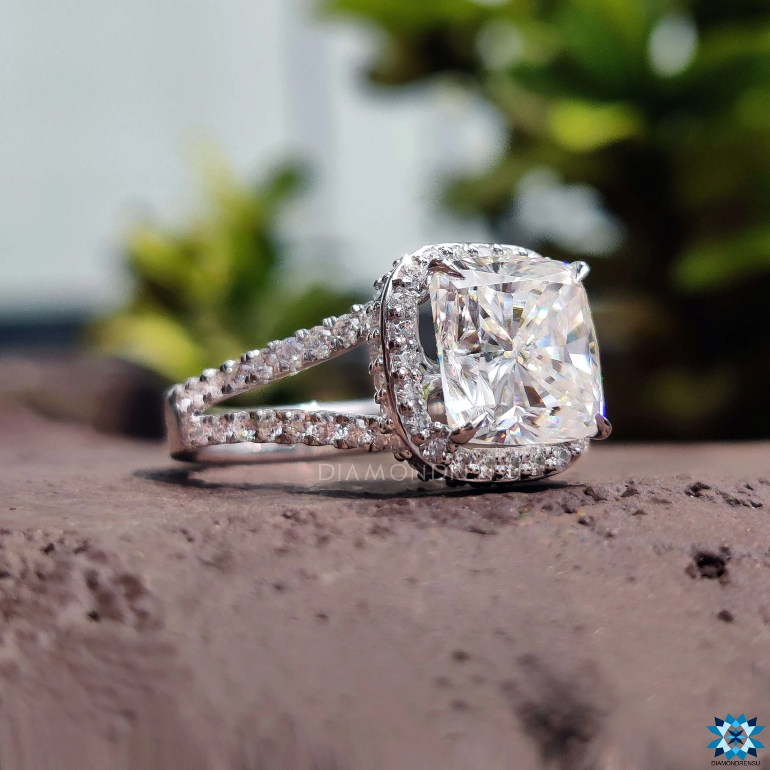 This amazing moissanite engagement ring features center dazzling cushion moissanite surrounded by a halo setting of tiny round cut moissanite. The lovely split shank adds an extra shine to the moissanite wedding ring