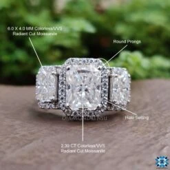 Be the first to review “4.01 TCW Radiant Cut Colorless Moissanite Three Stone Halo Engagement Ring” Cancel reply