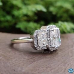 Beautifully crafted amazing three-stone halo moissanite engagement ring features three radiant cut moissanite stones with a round brilliant cut sparkling halo