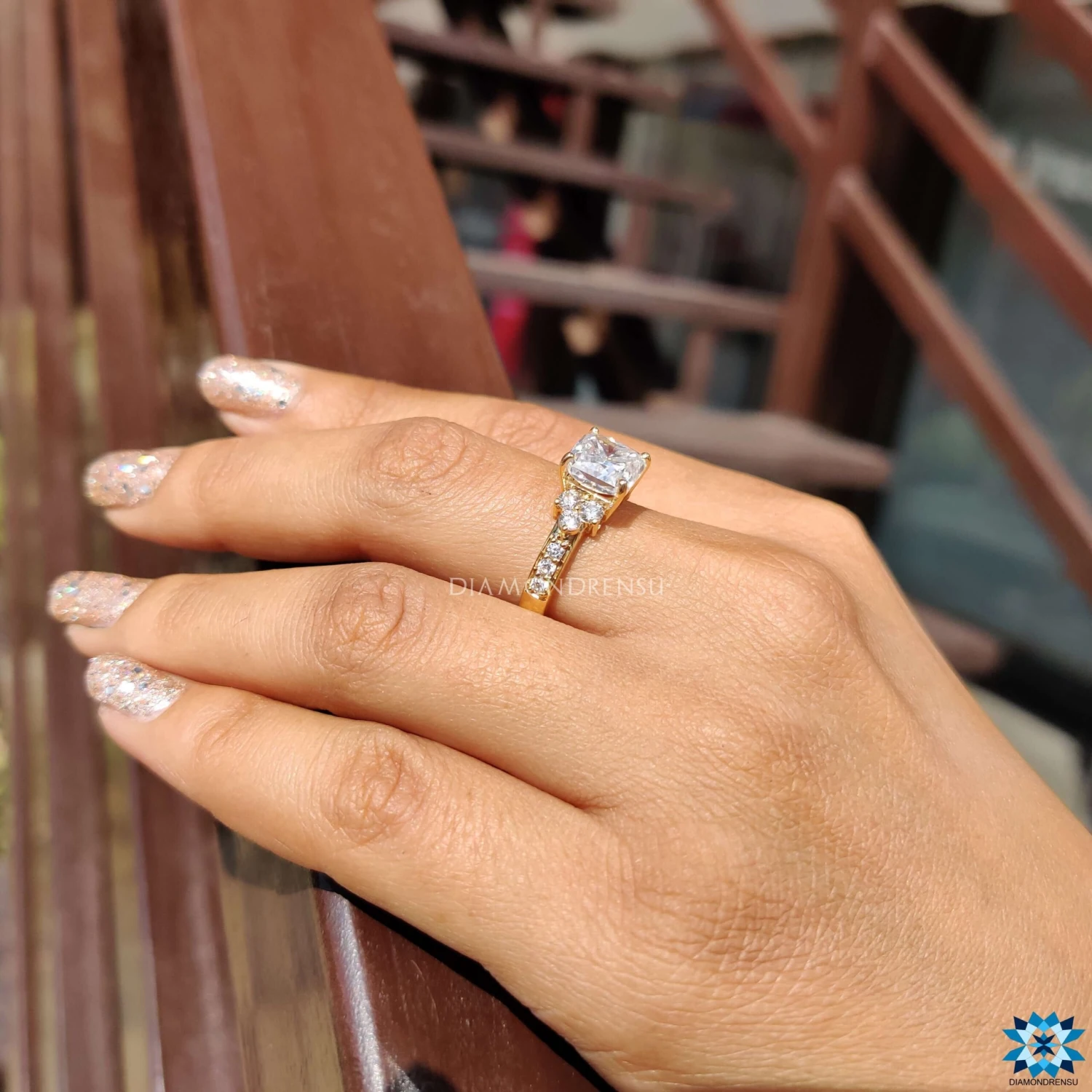 For those who love modern yet classy moissanite jewelry collection, This unique moissanite engagement ring features a delicate muse setting of tiny round moissanite diamond that gives am unique light to the center square radiant cut moissanite looks pretty in solid yellow gold