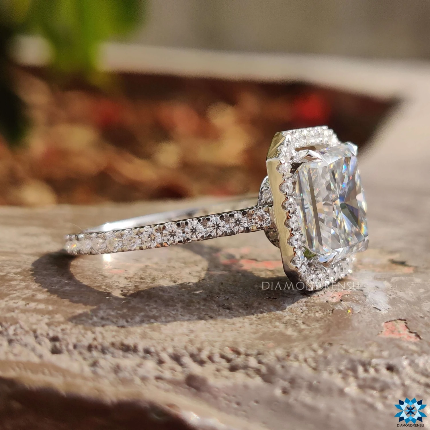 This radiant cut engagement ring offers incredible sparkle with its precise design, This moissanite engagement ring includes center light gray radiant moissanite combine the stylish lines of a rectangular shape with the brilliance of a traditional round moissanite