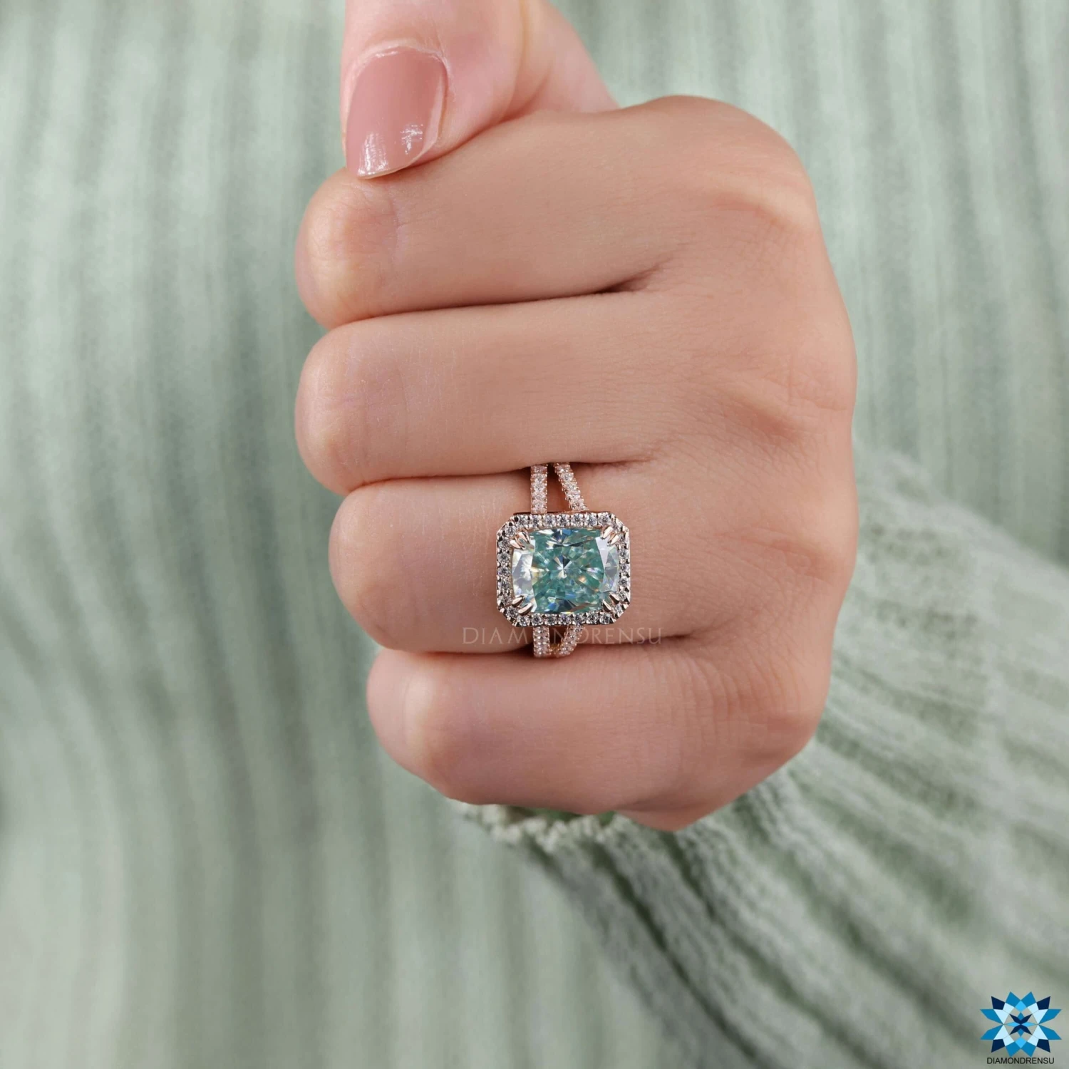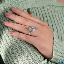 This unique moissanite engagement ring comes with a beautiful double claw prong setting. Halo setting of round moissanite surrounding the center cyan blue cushion moissanite. The split shank design will have a visible gap between the shank and the center stone. This can have the effect of making the stone appear larger and bigger.