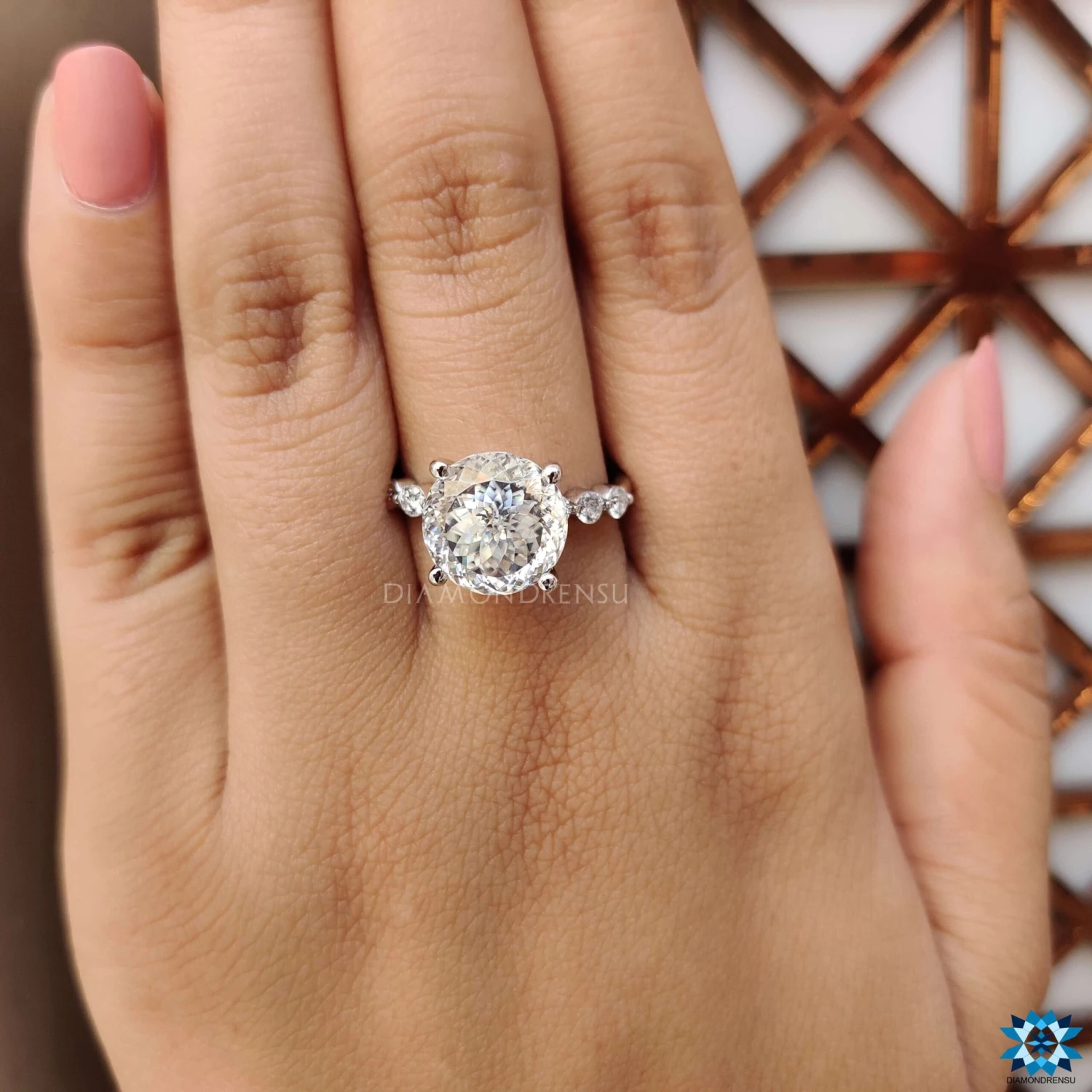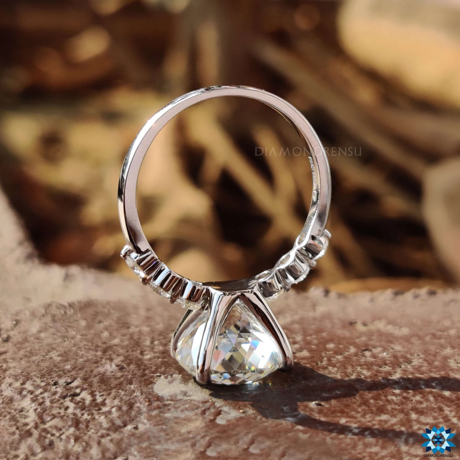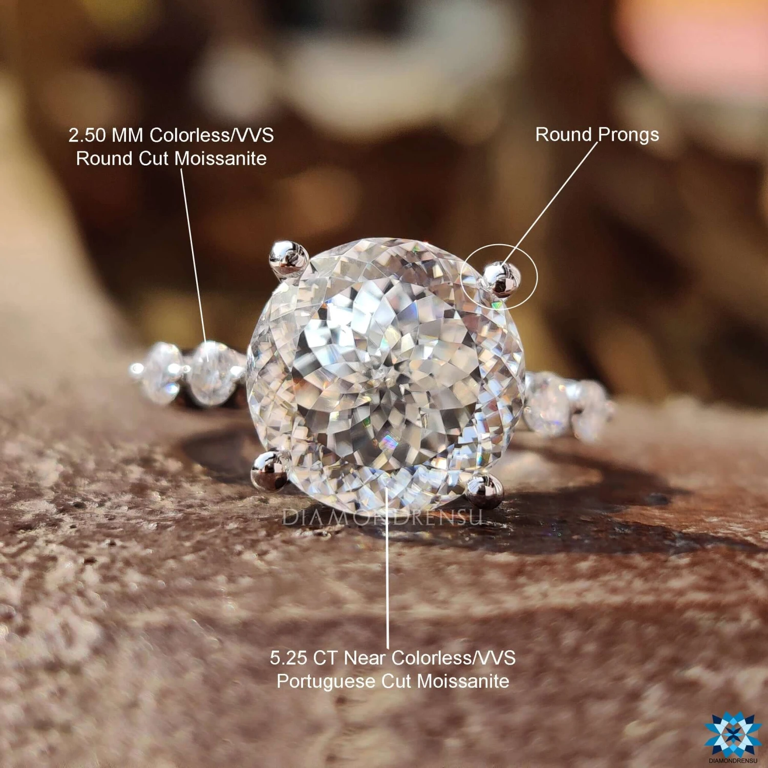 This antique floating bubble pave set moissanite wedding ring includes Portuguese cut moissanite as a center charm with a unique floating bubble set of lovely tiny round cut moissanite diamond. Create your best mother’s day gift ring with Diamondrensu