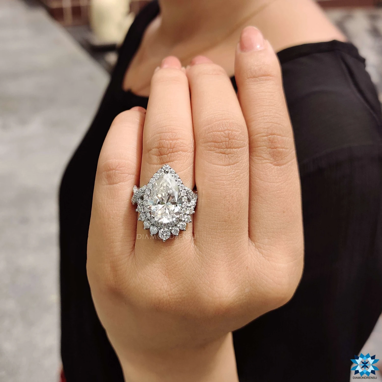Pear cut moissanite diamond is also referred to as a teardrop cut. The beautiful halo engagement ring is the perfect and best Christmas gift for her.