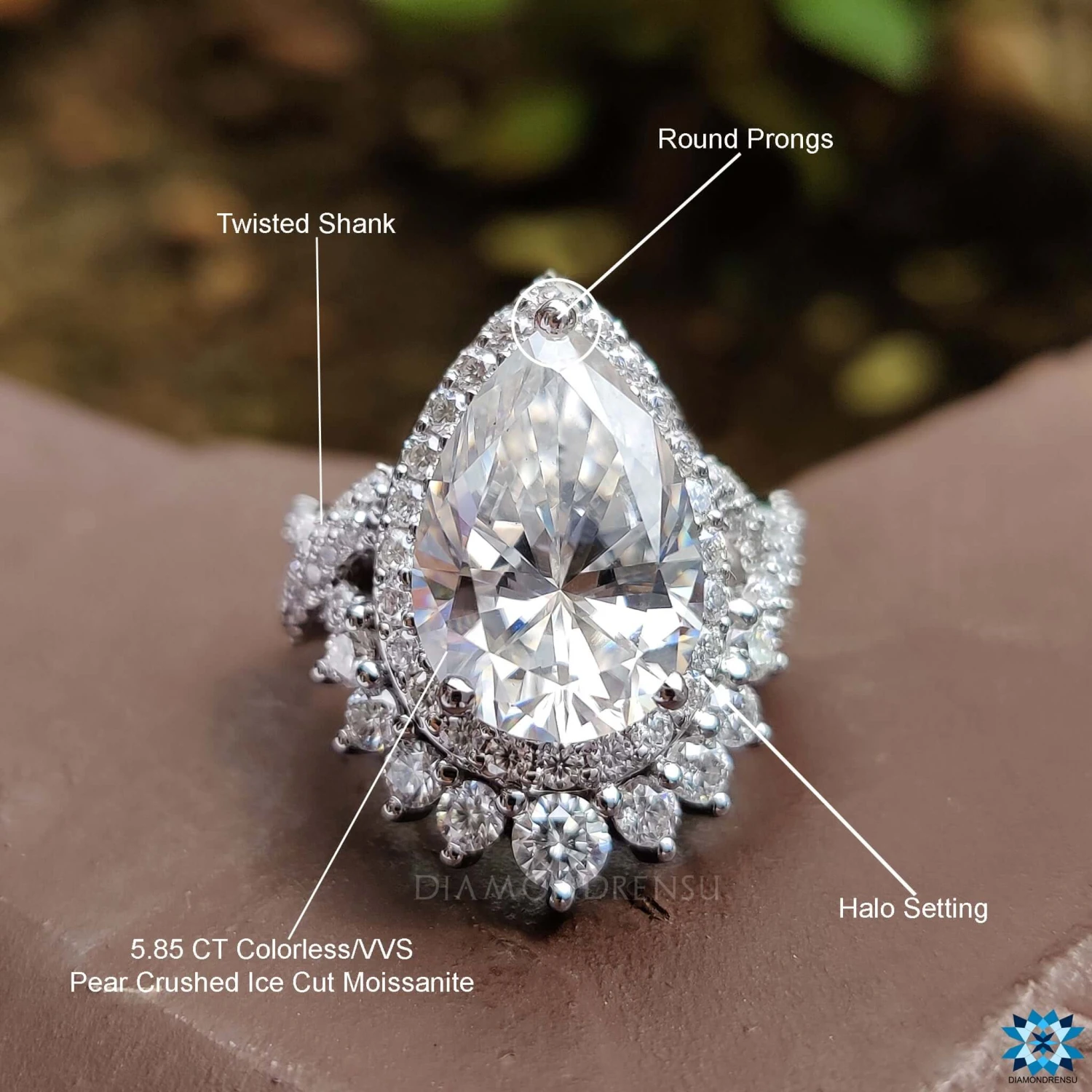 This vintage inspired listed moissanite halo engagement ring comes with a center 15 x 9 MM pear cut moissanite. It is beautifully surrounded by a colorless round cut stone. The halo setting beautifully covered the center stone with sparkling beauty, and makes the center stone larger and bigger on your finger to the wearer. Cross over pave shank of tiny round cut rich halfway of the shank and adds an extra shine to the ring.Â