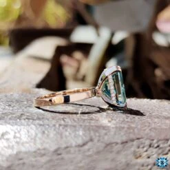 This elegant engagement ring features a glittering hidden halo setting of the round moissanite that wraps around the center charming cyan blue radiant moissanite while a sick band complements the gallery for a chic look. The amazing thick and flat shank of the ring adds sharp looks to the moissanite ring.
