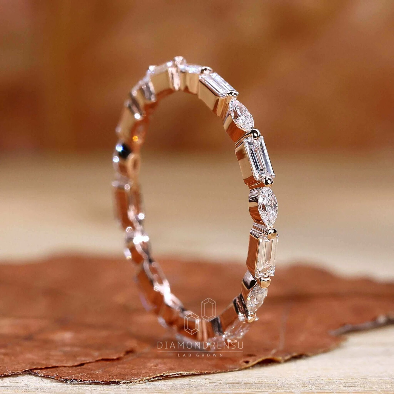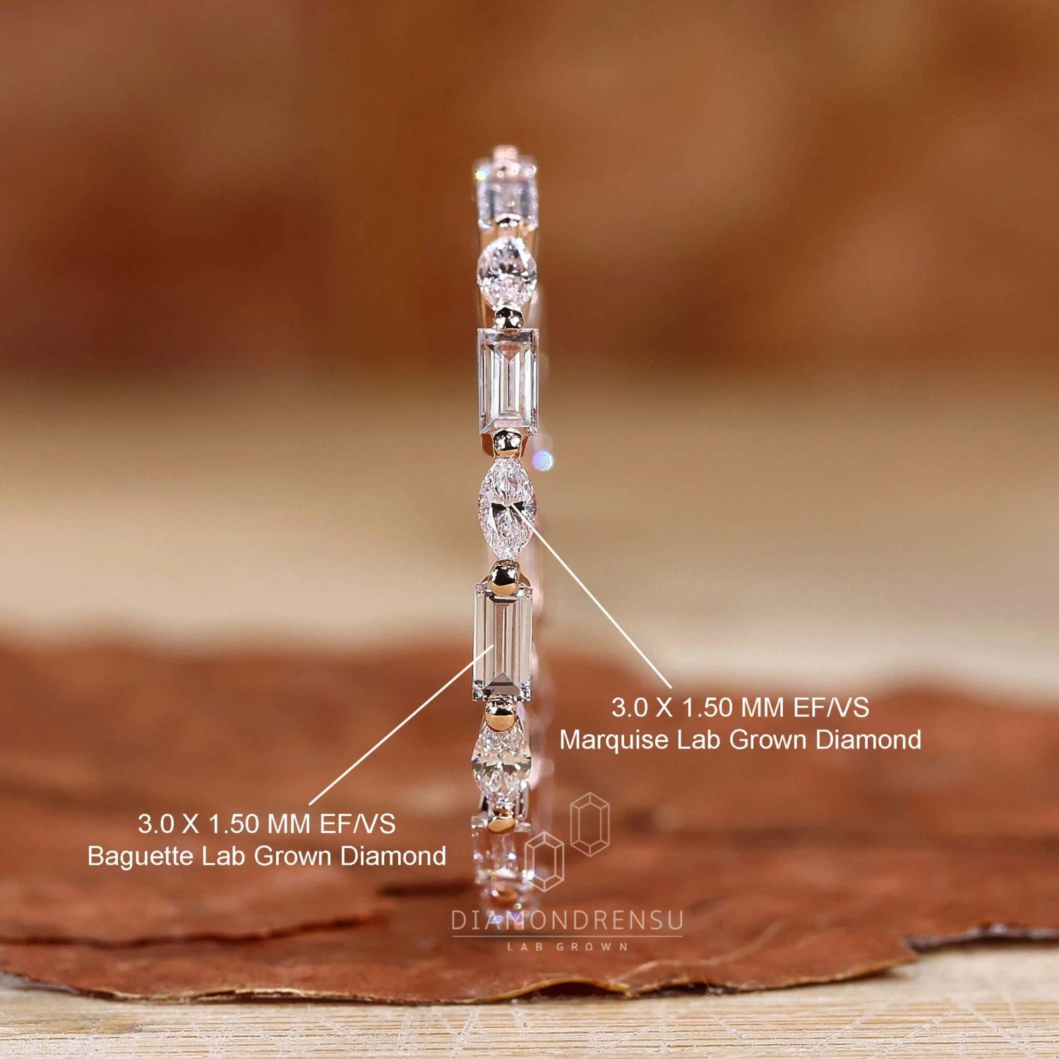 This exquisite Alternating Marquise and Baguette Cut Diamond Dainty Wedding Band is a timeless way to commemorate your big day. Crafted from lab grown diamonds, it features alternating marquise and baguette cut diamonds, creating a truly stunning eternity wedding band. Wear this sparkling beauty and make it your special symbol of love.