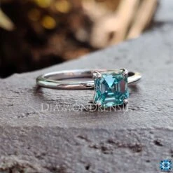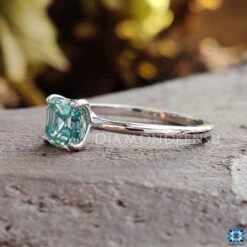 This best moissanite engagement ring features a center cyan blue Asscher step cut captured by double claw prongs. The timeless yet modern beauty of an engagement ring that is suitable for every occasion is the perfect choice for you. This ring includes a tapered shank that tapers either side of the center stone and gives traditional look to the ring. There are affordable moissanite engagement rings with a double claw prong, but they are also made with four prongs.