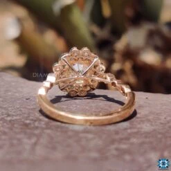 This unique moissanite engagement ring features center jubilee cut set in claw prongs. Milgrain flower halo setting of tiny round cut surrounding the center jubilee cut and makes it more bigger and larger. Calssic cathedral setting displays an elegant and classic display to set the cente stone.