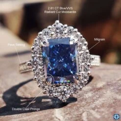 Go big and propose to her to the love of your life with this classic intricate vintage moissanite engagement ring. The vintage halo design is to die for with a fancy blue radiant cut moissanite stone set in the center of the moissanite engagement ring.