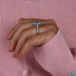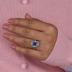 The listed beautiful engagement ring features a center shine of blue radiant moissanite surrounded by the sparkling halo of minimal round cut moissanite. This intricate radiant moissanite engagement ring will save the day in case your proposal falls short of convincing your love.